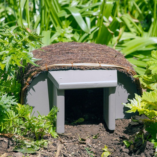 The house provides shelter and sanctuary from dangers in the garden. Underneath the textured brushwood finish, there is a sturdy steel frame covered with a waterproof felt lining. The wooden entrance door forms a short predator defence tunnel, small enough to deter access to dogs or badgers.